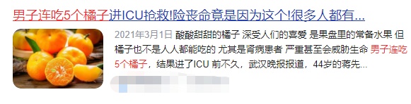 有新闻报道一男子本身为肾病患者,在一口气吃下了5个橘子后就晕倒在地,被紧急送往医院,随时可能引发心脏骤停。