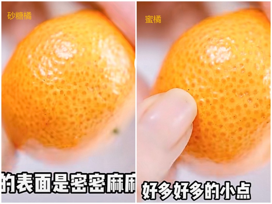 ①看表皮:砂糖橘表面密密麻麻,蜜桔表面有小点!