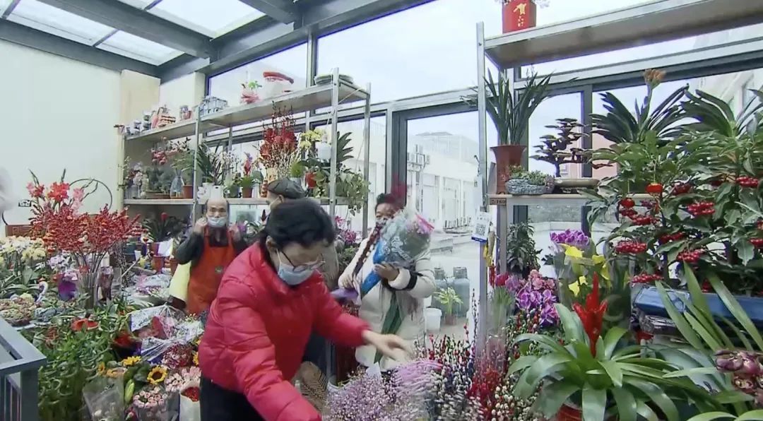 尤其在一个卖鲜花的摊位上,许多市民正在选购年宵花,准备把家里打扮得更加喜庆。一位市民表示:康乃馨代表长寿,祝老年人健康。银柳代表红红火火,明年更加好!