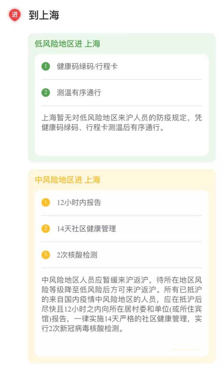 2、国内疫情中高风险地区人员应暂缓来沪返沪,待所在地区风险等级降至低风险后方可来沪返沪。