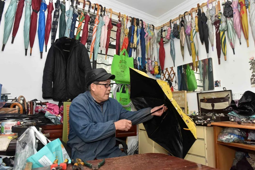 走进德都路165弄41号,只见门口一间十几个平方的小屋子里到处都是伞。墙上挂着的,是修好的雨伞;桌上堆着的,是居民们送来的坏伞;地上放着的,则是伞架等各种零配件。这里就是张永兴的工作室。