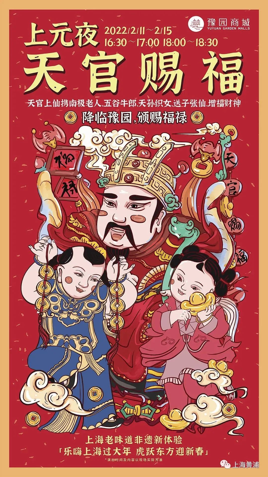 活动中,“天官”连同南极老人、五谷牛郎、天孙织女、送子张仙和增福财神,将闪现于豫园各处福地与大家共闹元宵。