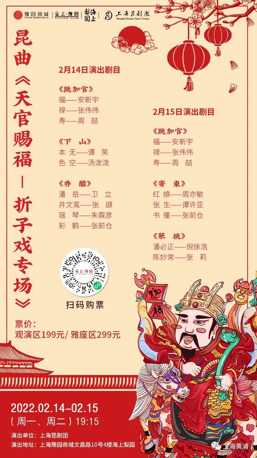 豫园商城内的海上梨园,是俯瞰豫园的高空戏台,2月14-15日,连演两场新春吉祥大戏:昆曲《天官赐福——折子戏专场》。
