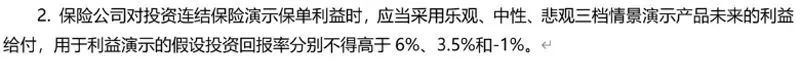 业内人士表示,《规则》希望降低消费者在投连险认知上的误区。投连险虽是偏投资、储蓄、理财功能的产品,但它毕竟也是保险产品。因此在利益演示上,《规则》也改变了投连险高、中、低的利益演示方式,改为悲观、中性和乐观情景的演示,并且明确各档利益演示的假设投资回报率分别不得高于6%、3.5%和-1%。