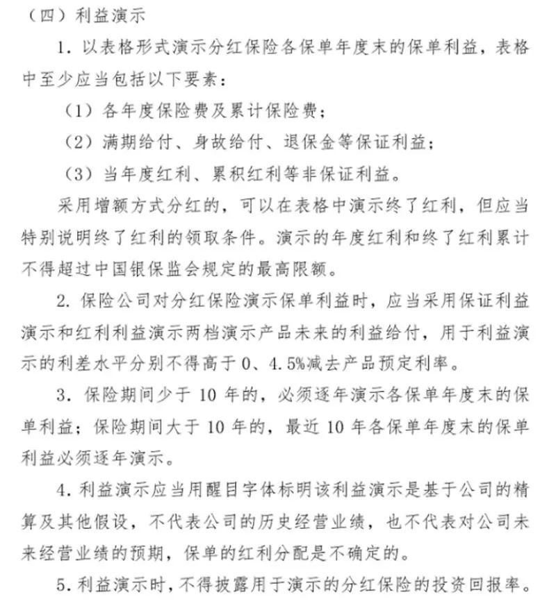 业内人士表示,分红型产品的利益演示原来分为高、中、低三档,《规则》将这块调整为保证利益演示(即最低水平)和红利利益演示(相对较高水平)两档。《规则》还要求用于利益演示的利差水平分别不得高于0、4.5%减去产品预定利率,这让红利利益演示的水平较以前下降了许多,更趋向险企实际分红水平。