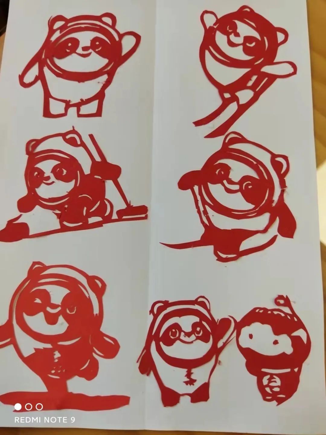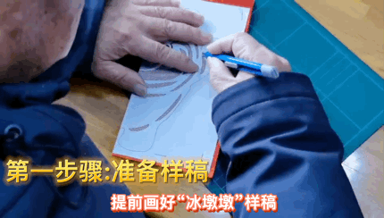 最大的难点是如何制作出冰面的纹理。林爷爷仔细思考,反复试验,用到了剪、刻两种技法,终于让冰雪的光华跃然纸上。冰墩墩的眼睛、头盔上面的彩色光环如何能剪而不断,也需要想办法。林爷爷会在初剪时预留连接处,待整体形状做好后,再将连接部位刻掉,用镊子小心地移除。