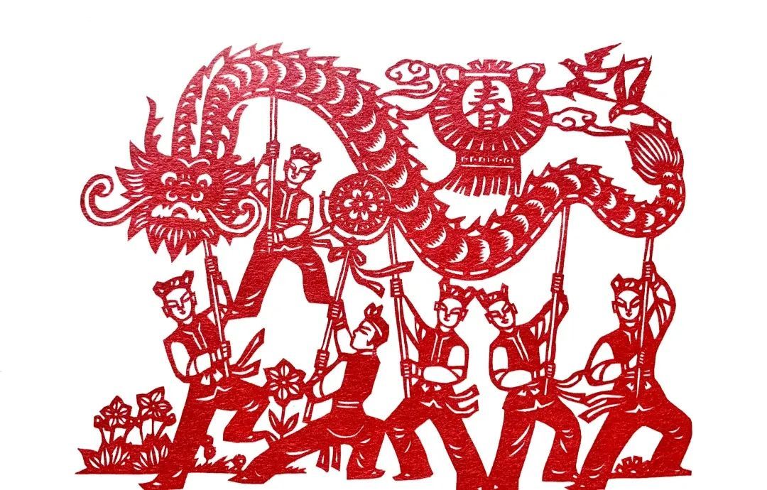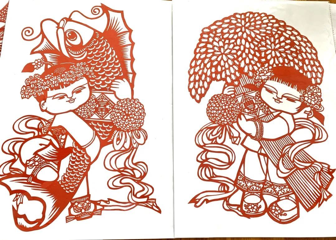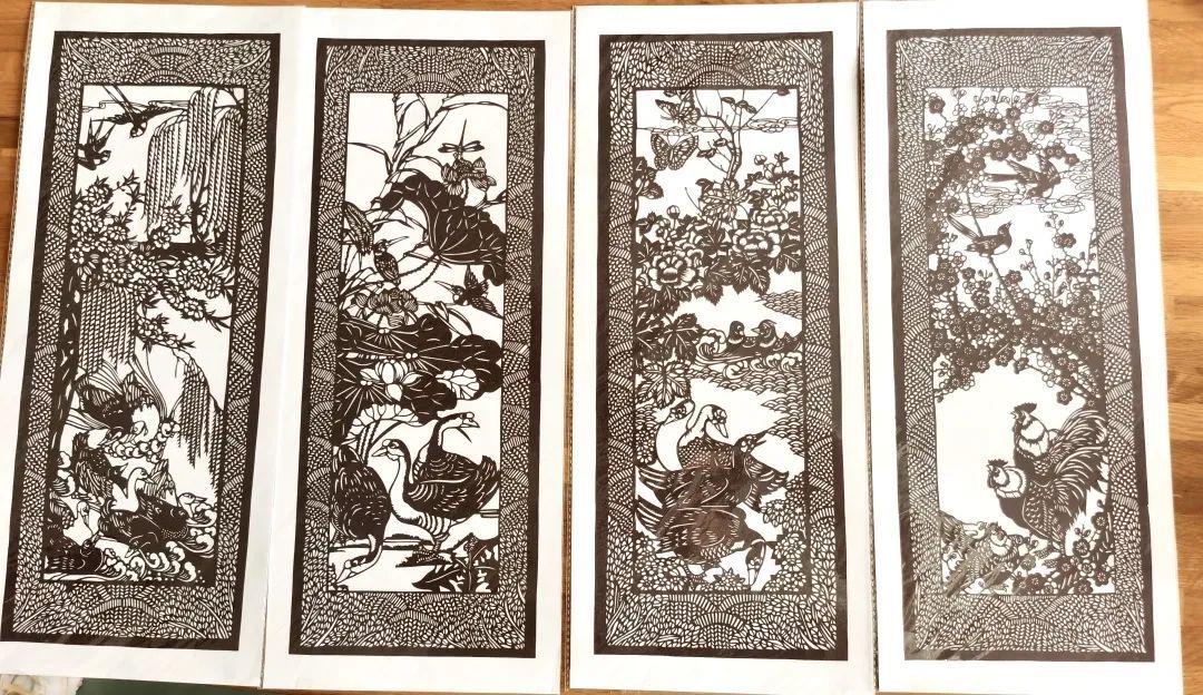 一纸一故事,剪纸代代传承,不变的是材料和技法,变的是内容。你看这幅《春夏秋冬》,以“杨柳”“莲花”“秋菊”“腊梅”串联起了四季,将国画的风格与剪纸相融合,有疏有密,精细得当,呈现出宜人的田野风光。