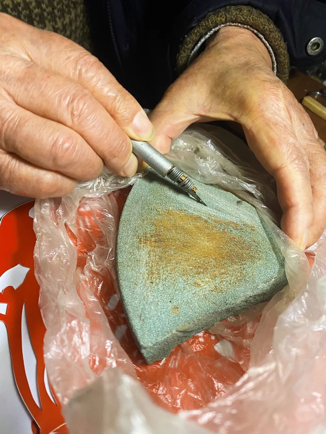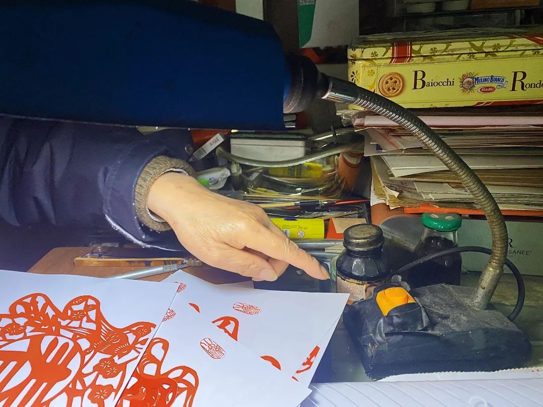 剪纸工具被装在几个盘子里,装食品的那种透明塑料盘。旁边,一盏锈迹斑驳的台灯也是从马路边捡来的,爷爷自己装了个开关,一用就是30多年。