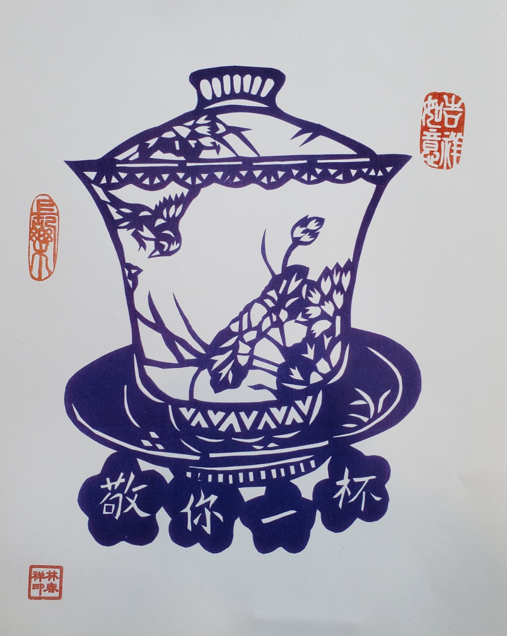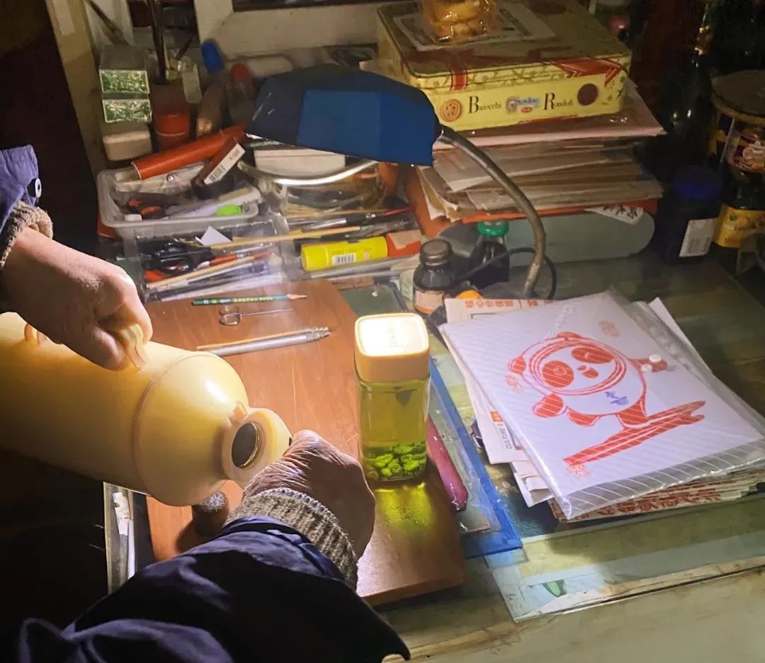 在客厅一角,这张大约2平米的小方桌,就是林爷爷每天剪纸的地方。每天早晨,他为自己沏一杯菊花茶,一坐就是大半天。退休二十多年,他从零学起,日日练习,有时眼睛花了,就闭目养神,等视力好一点再继续练习。
