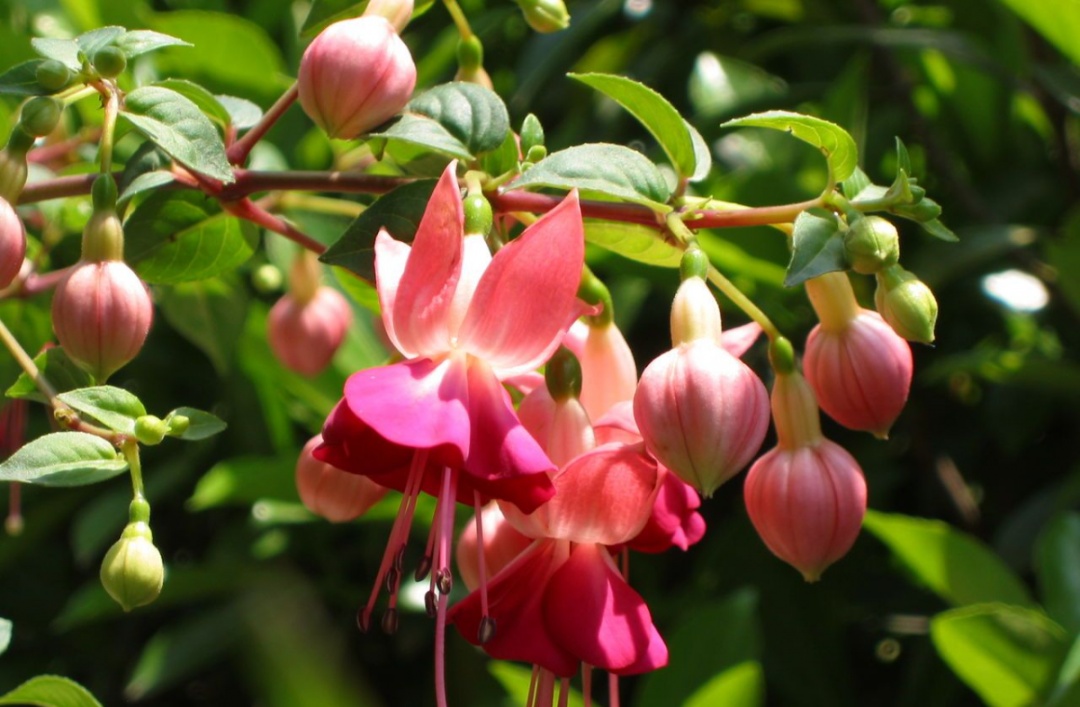 倒挂金钟,别名:灯笼花、吊钟海棠,为多年生灌木,开花时,垂花朵朵,婀娜多姿态,如悬挂的彩色灯笼,由于花色艳丽,花形奇特,花期较长,常作盆花观赏,夏季凉爽地区。可地栽布置花坛。园艺品种极多,有单瓣、重瓣,花色有白、粉红、橘黄、玫瑰紫及茄紫色等。有的植株低矮枝平展,宜盆栽;有的枝粗壮,枝丛不开展;还有少数观叶品种。