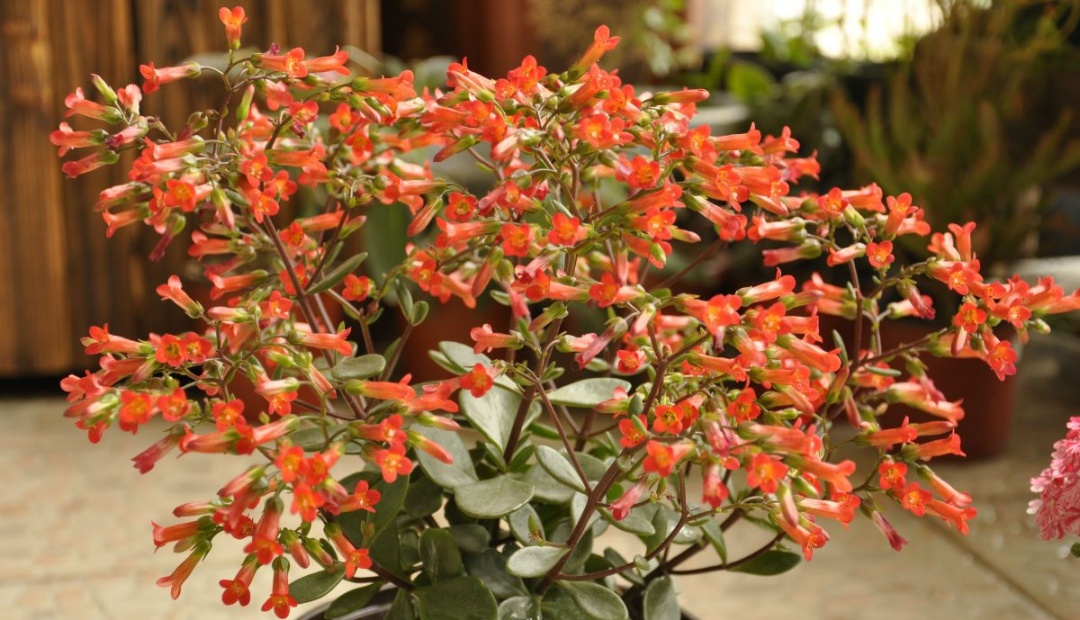 宫灯长寿花,也叫珍珠风铃、灯笼菜,为多年生草本植物。茎木质化,多分枝,新生分枝柔软常下垂,叶对生,长卵形,稍具肉质。花红色,管状,先端4瓣稍分开,其外形酷似小提灯故此得名宫灯长寿花。