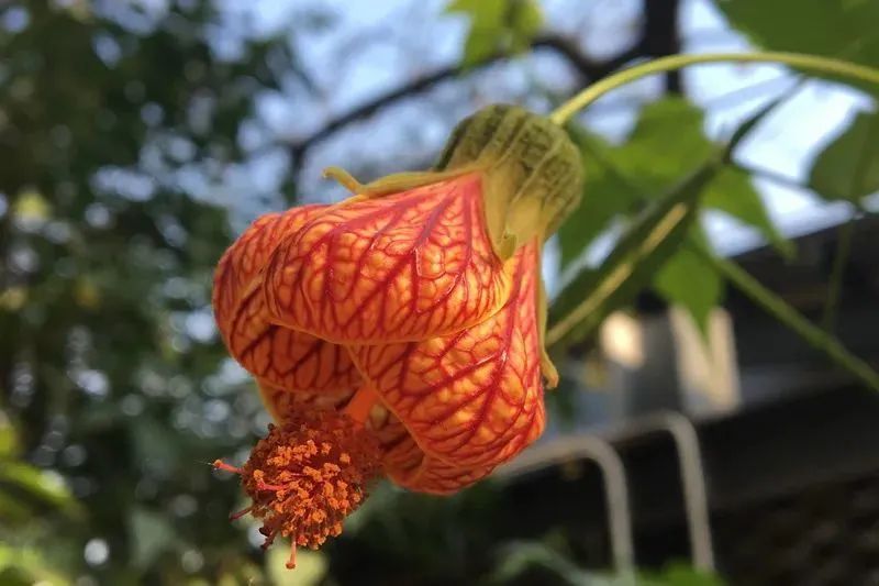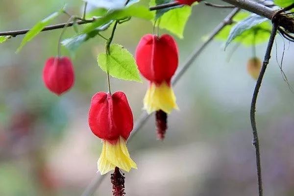 悬风铃花也称蔓性风铃花、红萼苘麻、灯笼风铃、红心吐金,为锦葵科苘麻属常绿蔓生植物,其枝蔓柔软,叶心形,有细细的叶柄,叶缘钝锯齿,花生于叶腋,具长梗,下垂,萼片心形,红色,花瓣闭合,由花萼中吐出,花蕊棕色,伸出花瓣,在适宜的环境中全年都可开花。