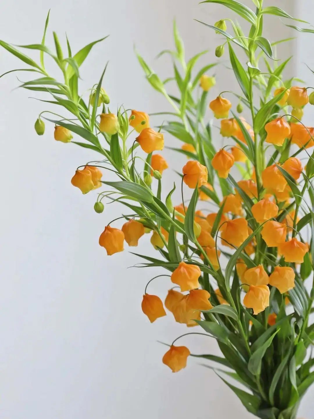 宫灯百合仅一属一种,为多年生球根草本,由于其花形花色酷似中国宫灯而得名。原产于南非东部地区,通常生长在潮湿的草地或林缘。因为在南半球它的花期恰逢圣诞节,因而别名“圣诞风铃”。娇美的外形,橙黄的“花灯”,衬托绿色的叶,极富特色。