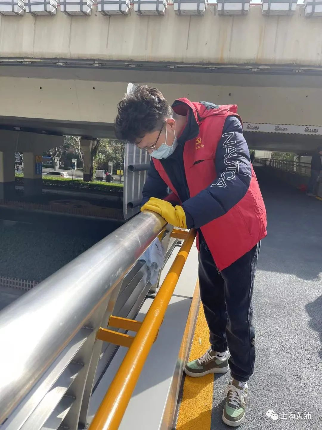 当天,正好是学雷锋日,区建管委市政所的志愿者们也来到了新加装后的天桥上,穿上红色志愿马甲,认真擦拭两侧护栏,做到不留死角、不漏一处,让行人通行更舒心。