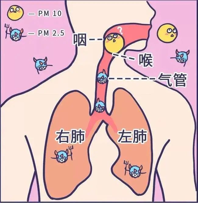 通过呼吸活动,大气颗粒物可直接进入并粘附在上呼吸道,刺激并破坏气管黏膜,破坏呼吸道的防御机能,尤其是粒径较小的颗粒物会沉积于下呼吸道和肺泡中,易引起上呼吸道感染、支气管炎和肺炎等疾病,这与颗粒物引起呼吸系统氧化应激损伤和炎症反应有关。对于哮喘、肺气肿和慢阻肺等慢性呼吸疾病患者,颗粒物会诱发病情急性发作或加重。研究表明,对于健康人群,颗粒物暴露可导致肺部通气功能下降,长期处于颗粒物环境可诱发肺癌。