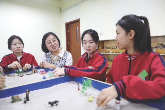 学校心理疏导室里,刘惠惠(左二)与学生共同参与心理沙盘活动。