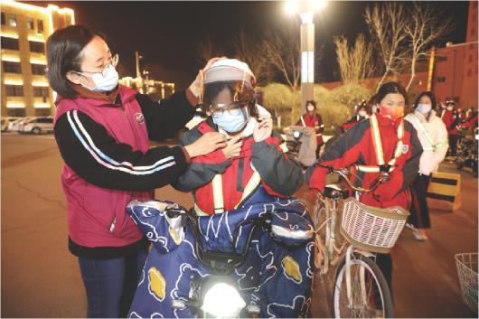 进行“全员管理值班”的刘惠惠(左一)在校园门口检查骑电动车的学生是否佩戴头盔和安全反光条。