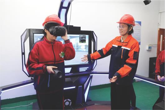 垦利区职业中等专业学校VR实训室,刘惠惠(右)指导学生体验虚拟现实仿真技术模拟出的工作环境。