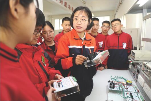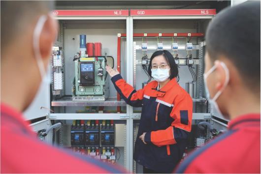 在“校企合作”企业山东春鹏电气有限公司里,刘惠惠(中)为学生讲解箱式变电站内部结构。