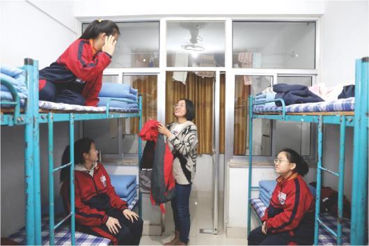 晚休前到宿舍巡查的刘惠惠(右二)叮嘱学生们温度波动时注意加衣保暖,避免感冒。