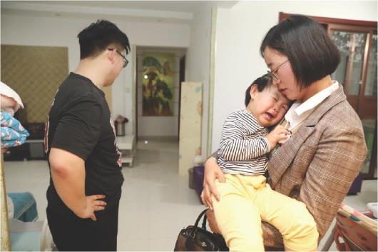 晚饭后,要去学校上课的刘惠惠,轻声安抚因不愿离开妈妈而哭闹的女儿。