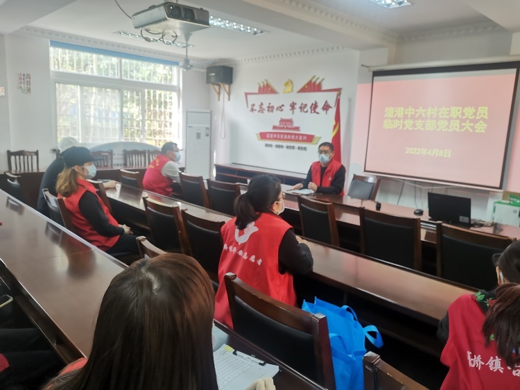 在向潼港六村居民区党总支申请,经高桥镇党委同意后,潼港中六村在职党员临时党支部于4月8日成立,党的组织建立在了志愿者团队上,来自政府机关、事业单位、学校、两新组织等的18名在职党员在党旗下集结。