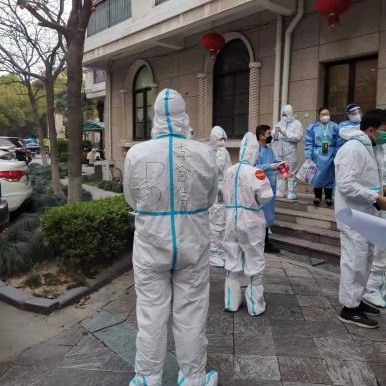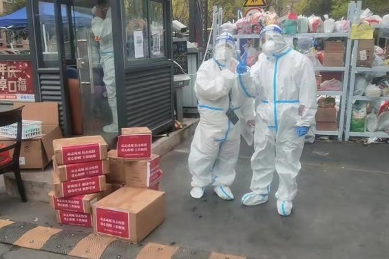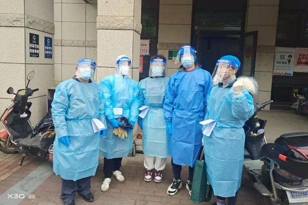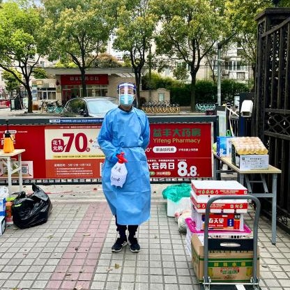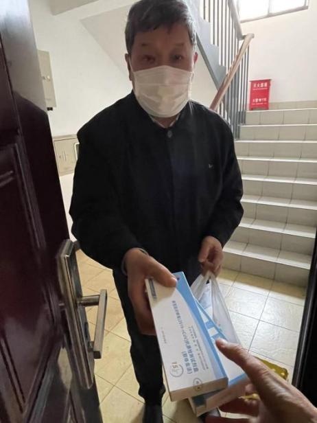 学会副会长、华东师范大学王大犇副教授为社区居民发放抗原试剂、分发物资和派送快递物品。