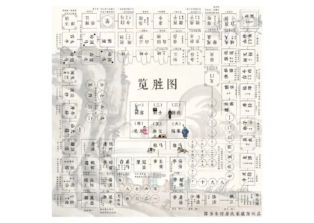 丰子恺先生的女儿丰一吟记述道:“那是一种类似飞行棋的游戏。”由六个人轮流掷骰子玩儿,六个人各代表词客、羽士(即道士)、剑侠、美人、渔夫、缁衣(即和尚)。一些打麻将用的筹子当作钱,一半公用、一半分成六份。从劳劳亭出发,一直走到长安市,每人轮流掷骰子,掷到几就走几步,每到一处都有名称典故,大家一面把玩,一面欣赏、交流游戏背后的典故和诗词。