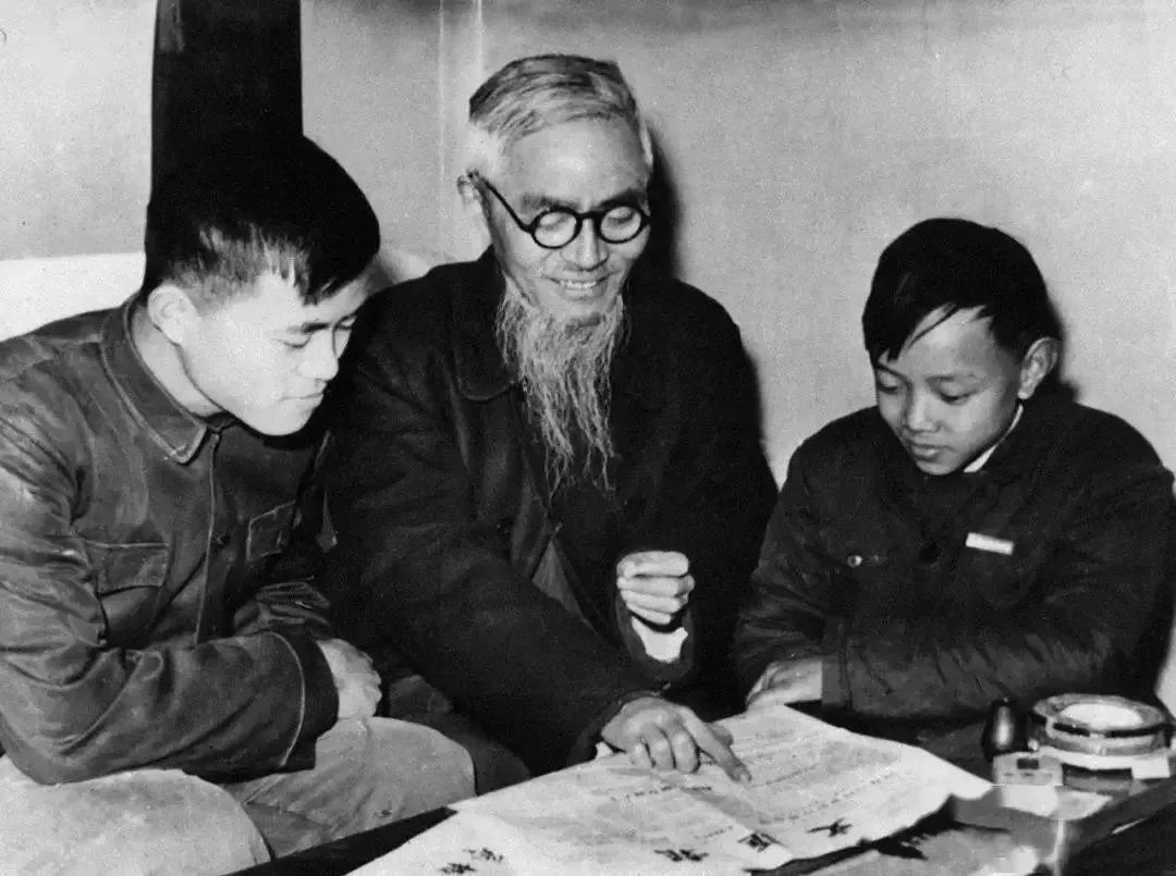 1955年,宋菲君(右)与外公丰子恺(中)、小舅舅丰新枚在上海日月楼中读报。
