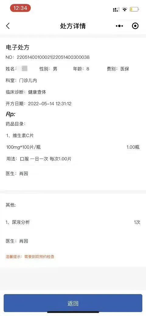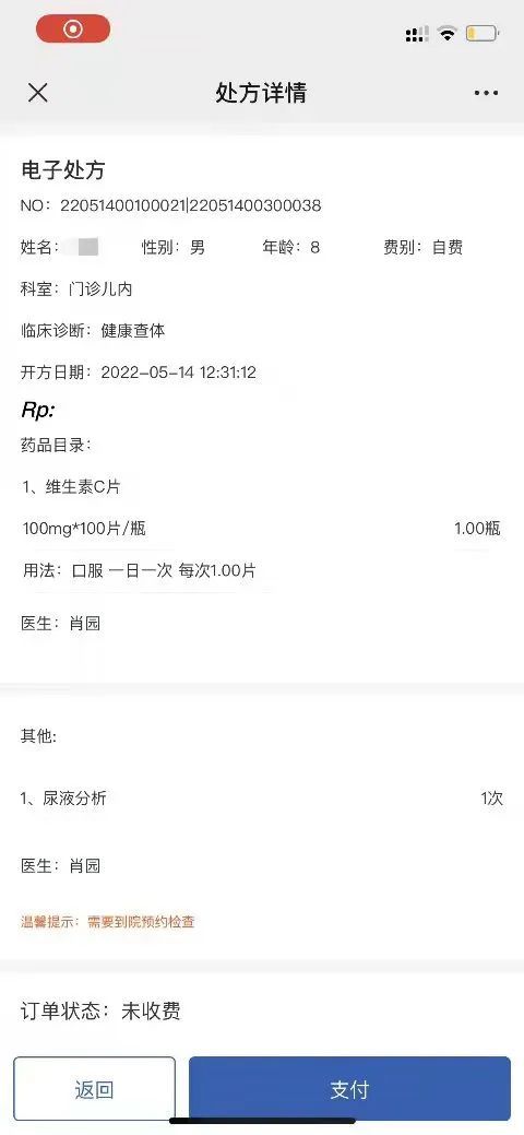 2、通过“处方待缴费”消息提醒或“订单中心”进入查看开具的处方详情,并可发起在线支付;