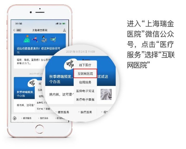 1、进入“上海瑞金医院”微信公众号,选择“医疗服务”-“互联网医院”进行预约挂号。