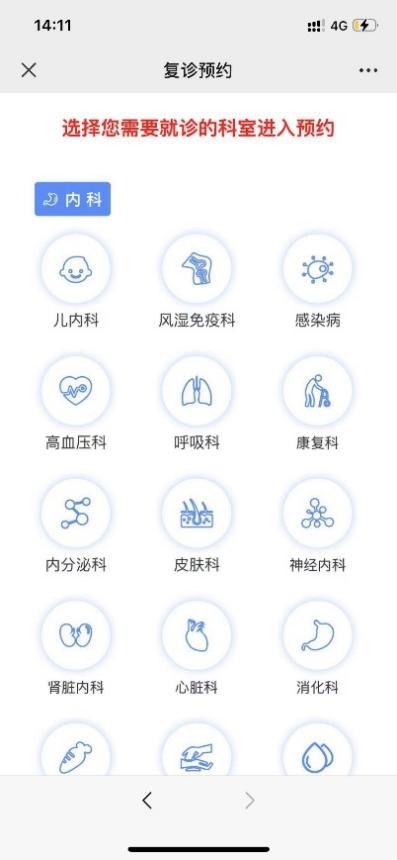 2、点击“复诊预约”进入就诊科室选择界面,选择“就诊人”和“就诊时间”,完成预约。