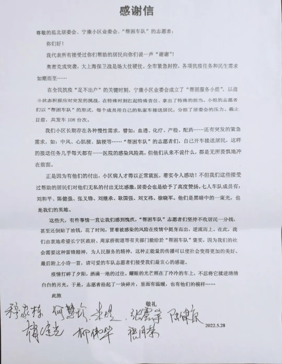 值得一提的是,“帮困车队”的志愿者们坚持不收居民一分钱,甚至还倒贴油钱,花了时间,冒着被感染的风险在疫情中挺身而出,让寻求帮助的居民们感动不已,也让大家感受到了关键时刻,邻里间最真挚的温情。