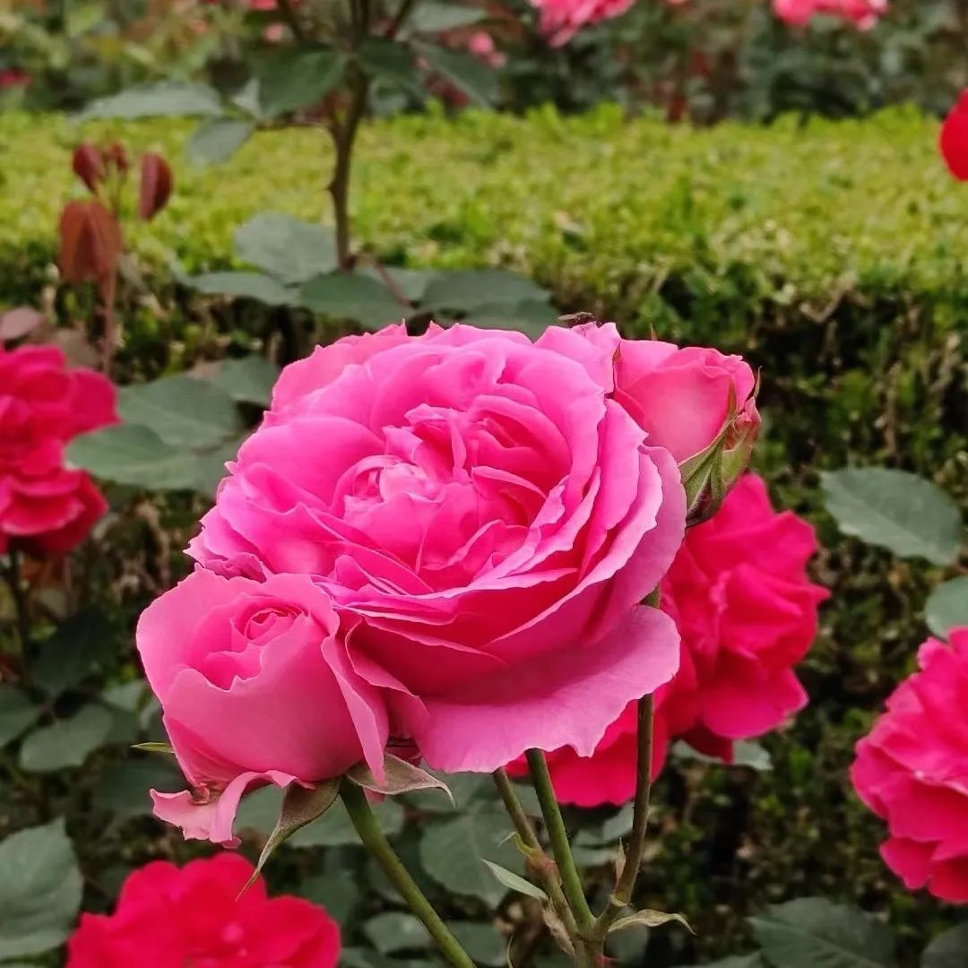 园内的灌木月季与瓜子黄杨绿篱相互映衬