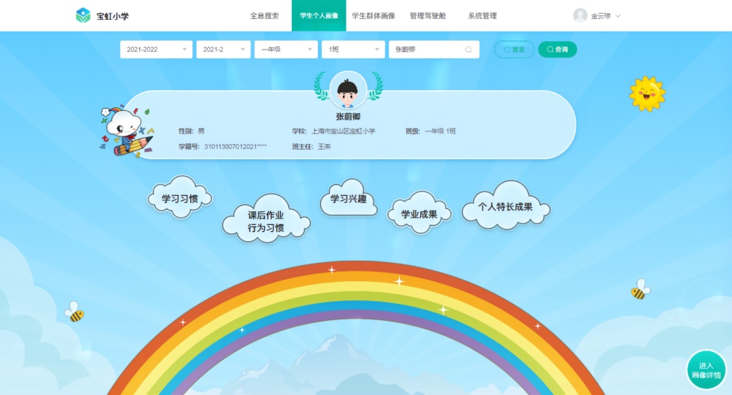 学校“七彩虹宝综合评价系统”的升级,推进了学生数字画像“1+n的大综评”。手机小程序与电子班牌结合的无感“云评价”系统让“每日一评”得以实现。