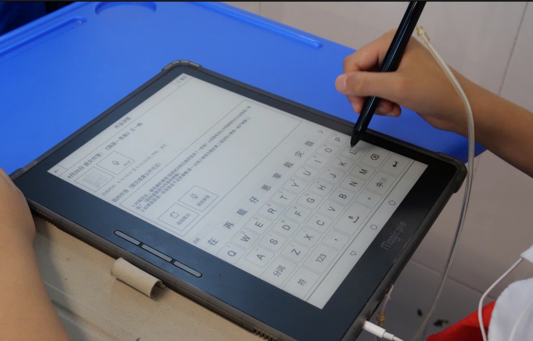 四年级学生借助绿色护眼的墨水屏实现了更多元的学习场景。教师根据学生需求,推送文本、音频等资源,学生可以自由选择语音、手写、文本等多种方式进行作业反馈,系统自动批阅。