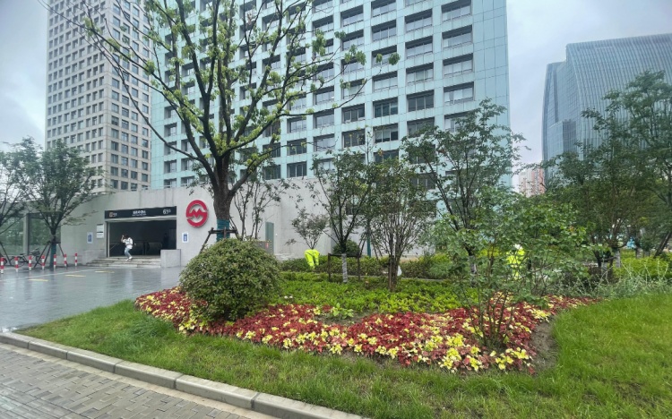 各站点多选用色叶类乔灌木,如芳芯路站以新优品种娜塔栎为主题树种,杨高路站多选用色叶类小乔木红枫等。