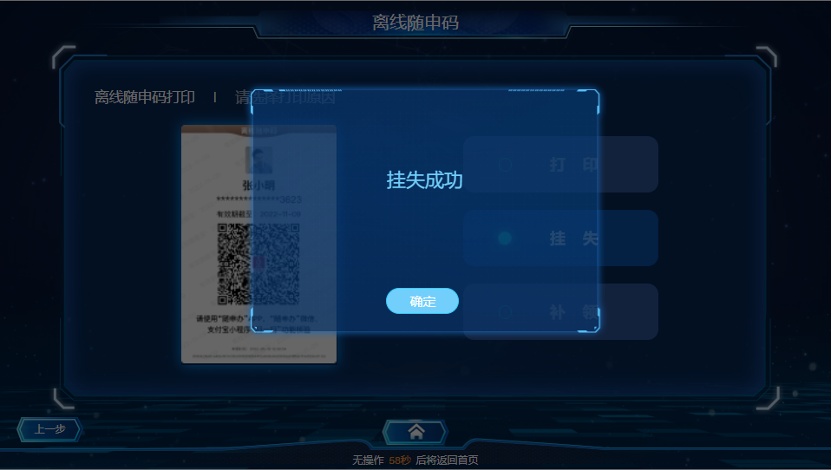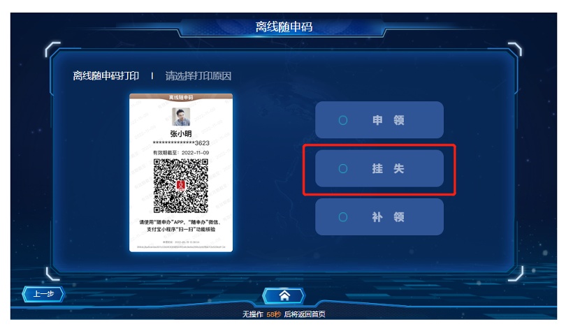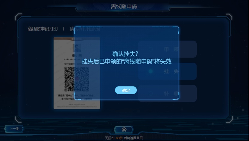 若您需要挂失离线“随申码”,可在自助终端上选择“挂失”按钮即可完成挂失手续。