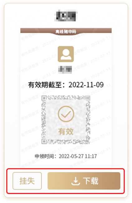 若您想挂失或二次打印离线“随申码”,点击“挂失”/“下载”即可。