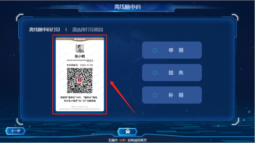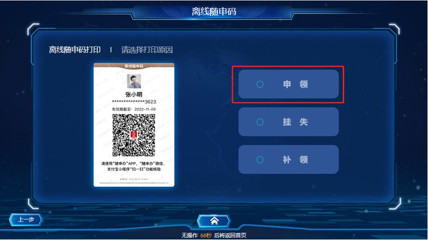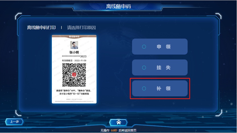 若您需要补领离线“随申码”,也可在自助终端上选择“补领”按钮完成补领。需注意“补领”后,之前申领的“离线随申码”将失效,无法进行核验。