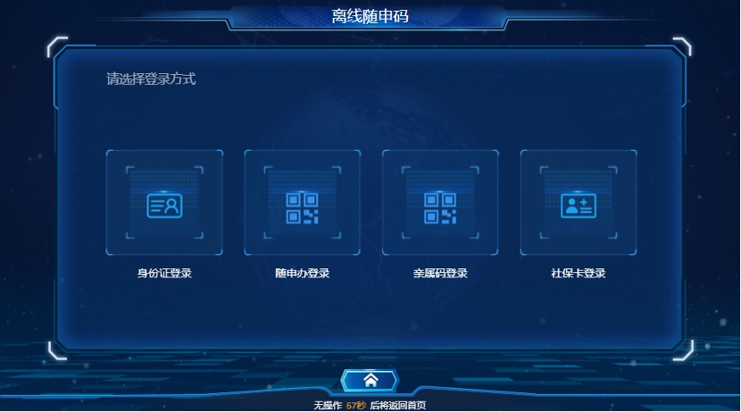 第二步:在自助终端机可选择任意一种登录方式:“身份证登录”、“随申办登录”,“亲属码登录”。