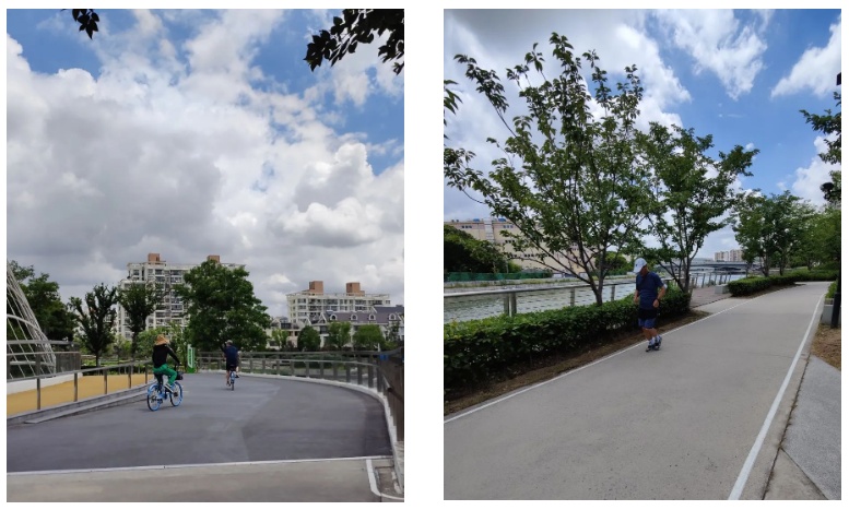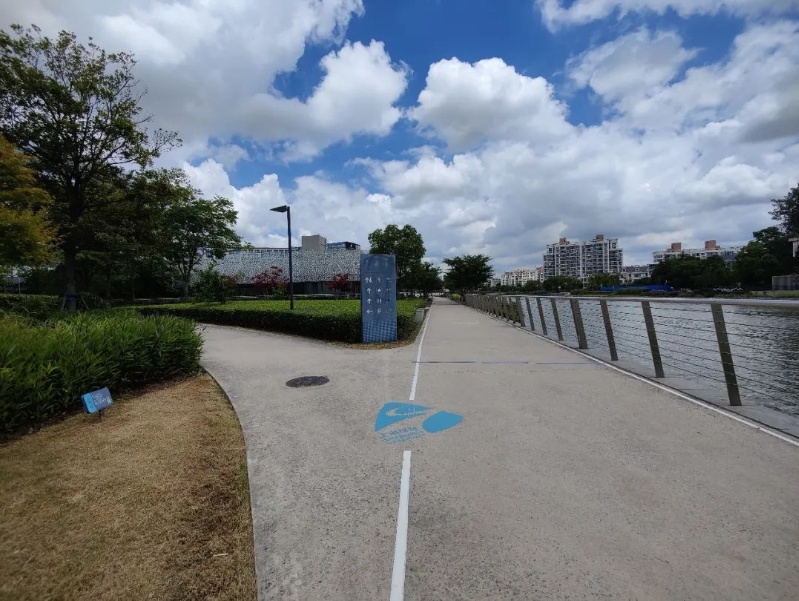 沿河的健身步道,即便中午时分,也有市民在锻炼。黄小姐就住在公园旁边的虹桥河滨花园小区,得知公园开了,7月1日第一天就在这里逗留了许久。“几乎每天都会和家人来这里散步,晚上夜景更是好看。不过现在晚上公园不开放,就先来欣赏白天的美景。”