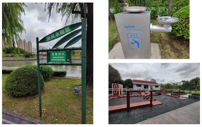 园内的篮球场等健身场所也暂未开放,不过园内随处可见便民衣帽架,可以方便市民挂包和外套,还贴心地提供直饮水,夏日游园很是方便。