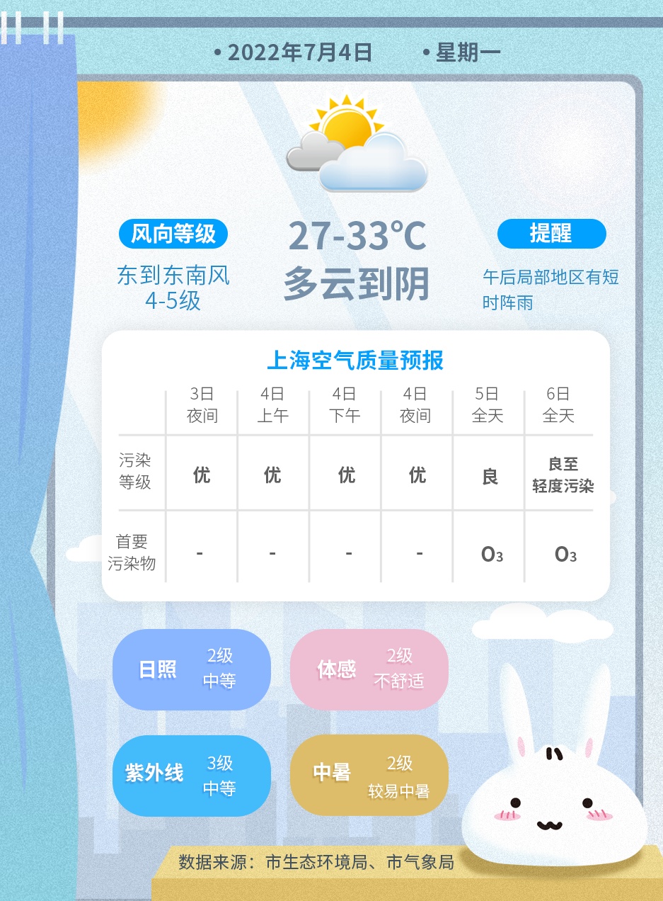 7月5日(周二):多云,午后局部地区阴有短时阵雨或雷雨,27~34度
