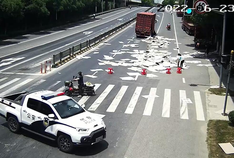 车辆转弯时,车上近千张硬板纸意外洒落在马路上,造成了交通安全隐患。日前,石湖荡派出所民警巡逻时发现这一紧急情况后,与热心市民协力处置,及时消除了隐患。
