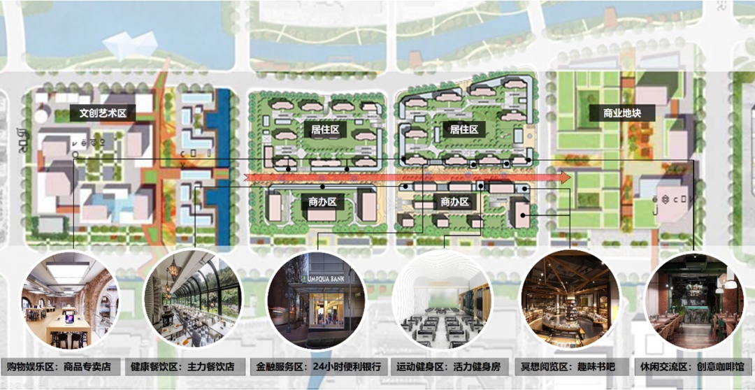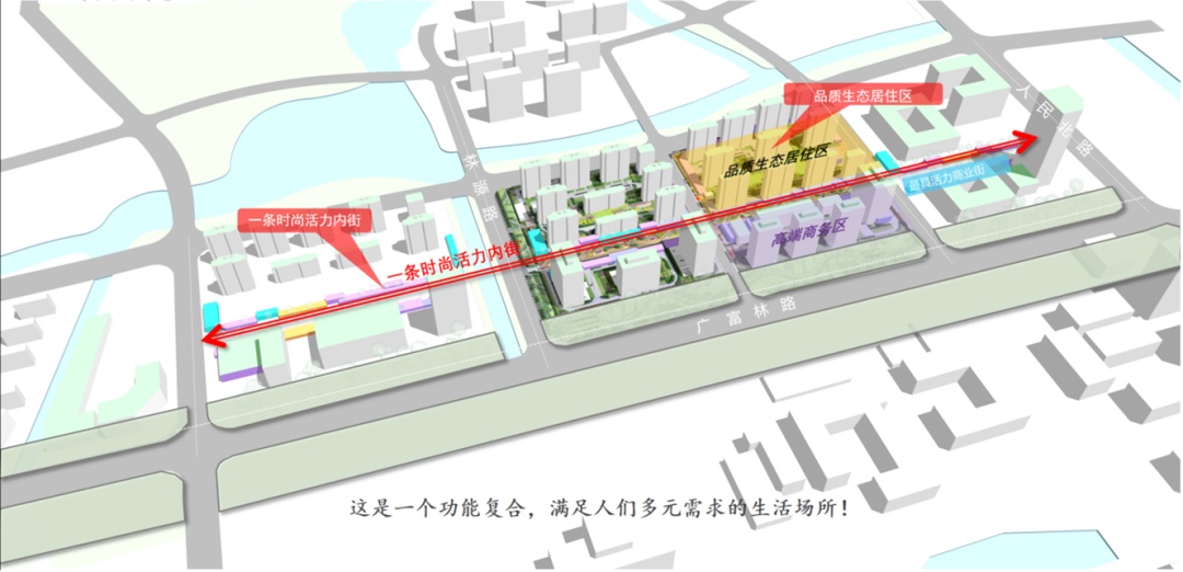 规划围绕三大主题展开:一个高端商务区+ 一条时尚活力内街 + 品质生态居住区。