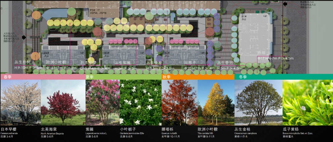 商办区景观主要植物有欧洲小叶椴、无患子、香樟、丛生香泡;