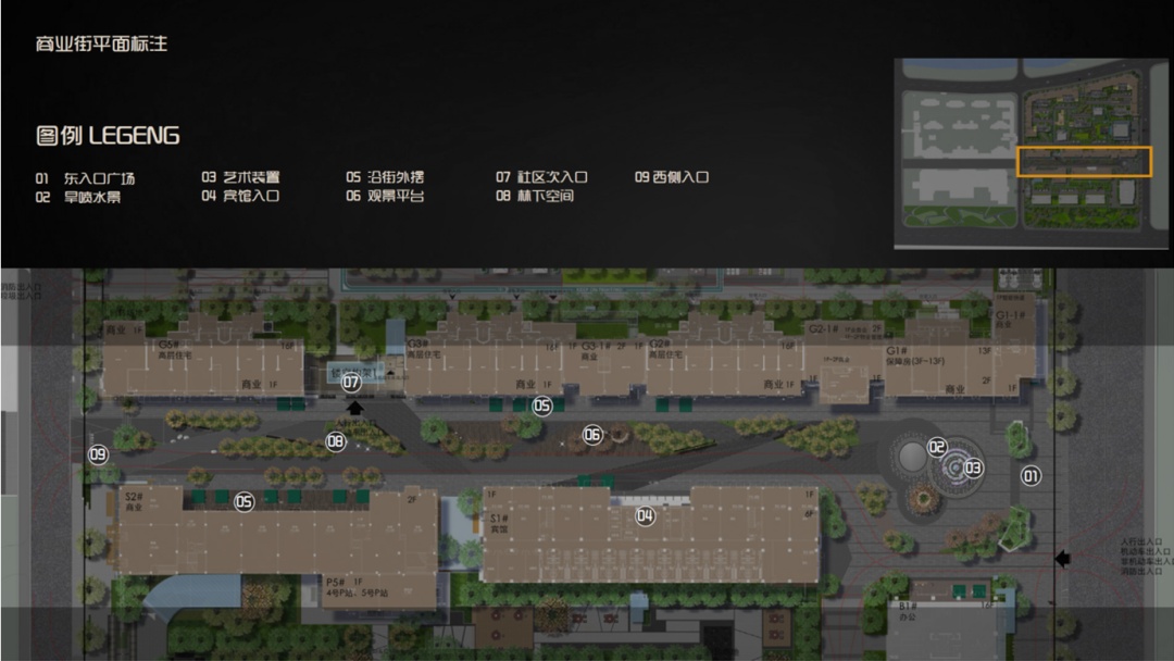 商业街道东侧入口处设置旱喷水景及艺术装置,作为入口昭示性空间节点,增加入口的昭示性与仪式感。