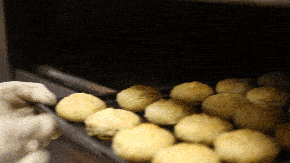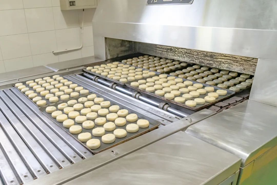手工月饼经过20余米长的烘烤隧道炉均匀烘烤后便可呈现个个色泽均匀、香气扑鼻的月饼了。
