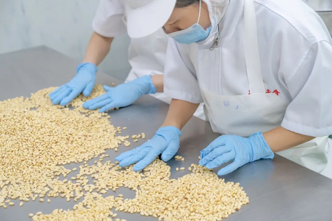 首先是馅料,通过细心筛选的果仁以配方配制成陷,每一粒果仁都是纯天然的高品质食材,使用无漂白面粉、反渗透净化水,确保每一只月饼的口感和味道。
